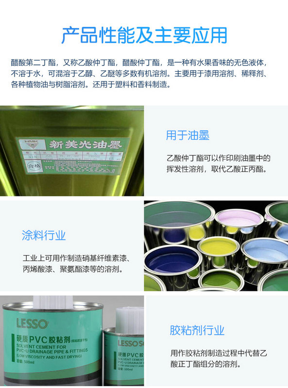 1.化學性質:和乙酸丁酯相似。加熱至500℃時分解成1-丁烯、2-丁烯、乙烯和丙烯。將乙酸仲丁酯在氮氣流中于460~473℃通過玻璃棉時,生成56% 1-丁烯,43% 2-丁烯及1%丙烯。在氧化釷存在下加熱至380℃,分解成氫,二氧化碳、丁烯、仲丁醇和丙酮等。乙酸仲丁酯的水解速度較小。室溫下在稀的醇溶液中發生氨解時,120小時有20%轉變成酰胺。在三氟化硼存在下與苯反應生成仲丁基苯。進行光氯化反應時,生成氯代丁基乙酸酯。其中1-甲基-2氯丙基乙酸酯占66%,其他異構體占34%。